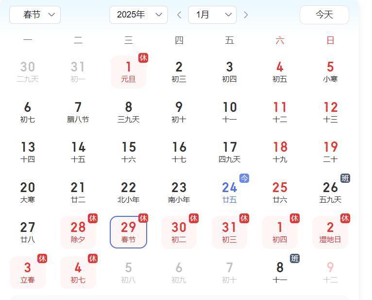 根据《关于上海证券交易所2025年部分节假日休市安排的通知》(上证公告〔2024〕38号),上海证券交易所现将2025年春节休市安排通知如下。