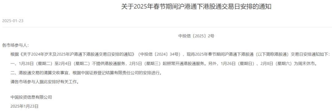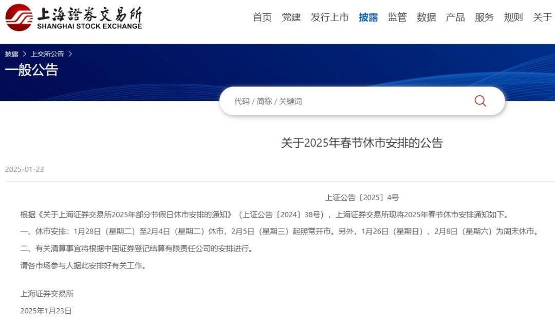 上交所关于2025年春节休市安排的公告