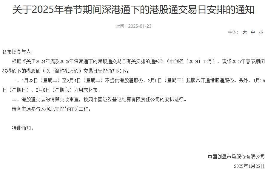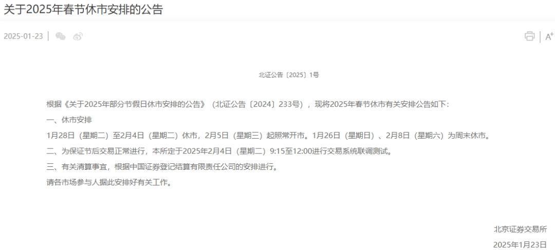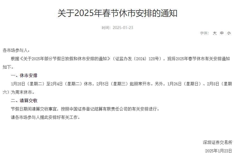 1月23日,沪深北交易所分别发布关于2025年春节休市安排的通知。据通知,1月28日(星期二)至2月4日(星期二)休市,2月5日(星期三)起照常开市。另外,1月26日(星期日)、2月8日(星期六)为周末休市。节假日期间清算交收事宜,按照中国证券登记结算有限责任公司的有关安排进行。