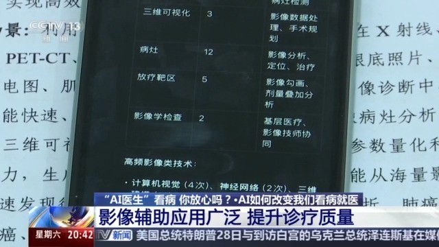 总台央视记者 郑怡哲:根据AI的分析,我们注意到有一个领域的词汇非常聚集,就是“影像”,出现了40多次,而像“CT”“MRI”“超声”“X射线”“病理”等具体影像检查的名词也多次出现。应用场景主要涉及影像分析、诊断、筛查、病灶定位、手术规划等场景。其实AI应用在医学影像识别领域由来已久,因为与自然语言和病情推理相比,图像的像素,更加容易转换为计算机可以识别和计算的代码,训练的素材也非常标准化和广泛。随着AI的升级和广泛应用,在图像领域应用AI的速度和准确度也在不断提升。
